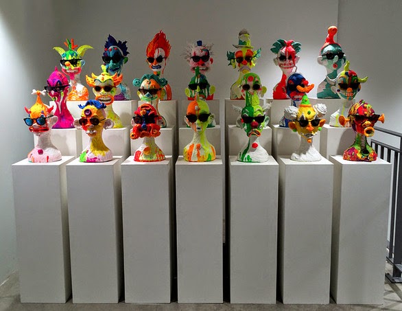 Upstairs, meanwhile, British artist and set designer Gary Card has an even more colorful contribution to the store this season. In the shop’s emerging designer showroom on the fourth floor, Card has installed forty of the his Talking Heads to show off sunglasses from the likes of Mykita and Cutler & Gross. Made for masking tape and covered in splashes of neon paint, these madcap clowns paradoxically provide the perfect canvas for showing off the store’s chic sunnies.